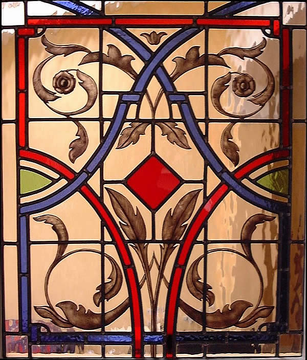 Classical Light This forms a connecting window between a kitchen and a newly built garden room extension. It was important to allow the passage of light into the kitchen so I have not overwhelmed the design with colour. By using glass paint to produce the floral motif the window achieves a fluidity of design that is uninhibited by the usual constraints of leaded glass. |