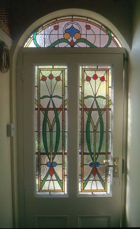 comfortable furnishings. Though located at the less frequented back of the house it was important to treat the stained glass not as a tasteful afterthought but as an equal opportunity for good design. |